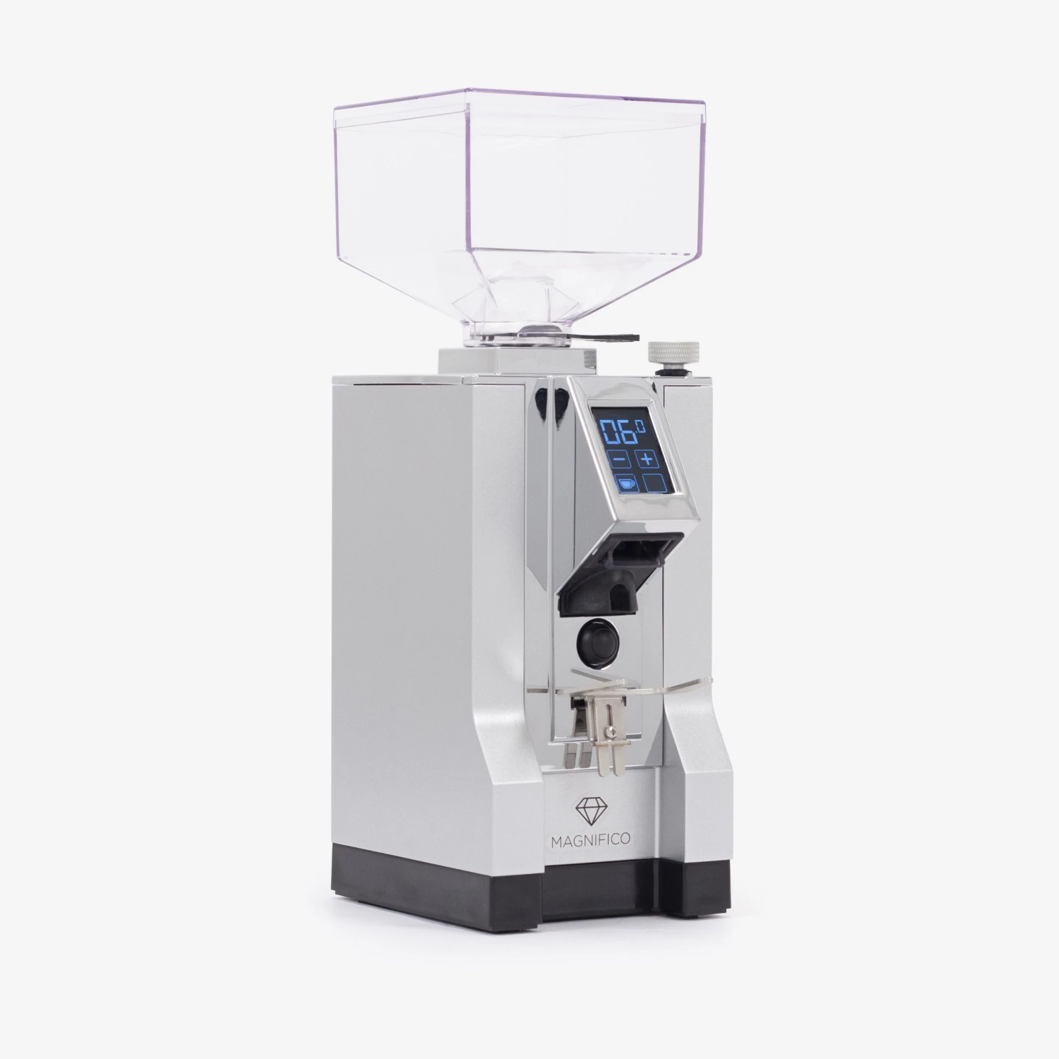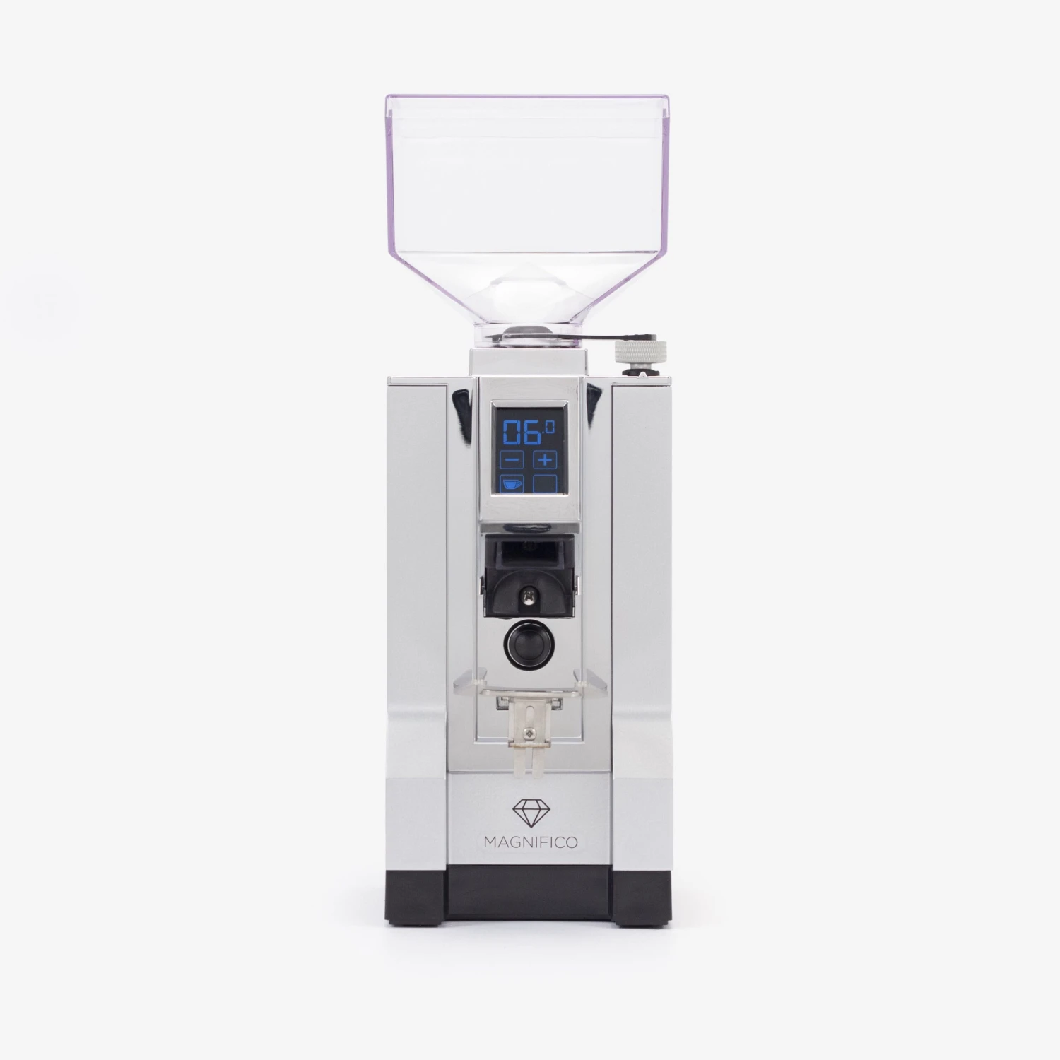 The Eureka Mignon Magnifico is an all purpose grinder with 55 mm flat hardened steel burrs that give it the highest output in Eureka’s Mignon range. Not only that, the Magnifico features specially designed “diamond inside” burrs which keep their edge for longer compared to stock burrs. The touch screen display is a stand out feature for a grinder so small, making adjustment as easy as it should be. With its larger burrs, the Mignon Magnifico can produce up to 1.8g of coffee per second for espresso, meaning it can produce a barista quality 18g double shot in as little as 10 seconds.