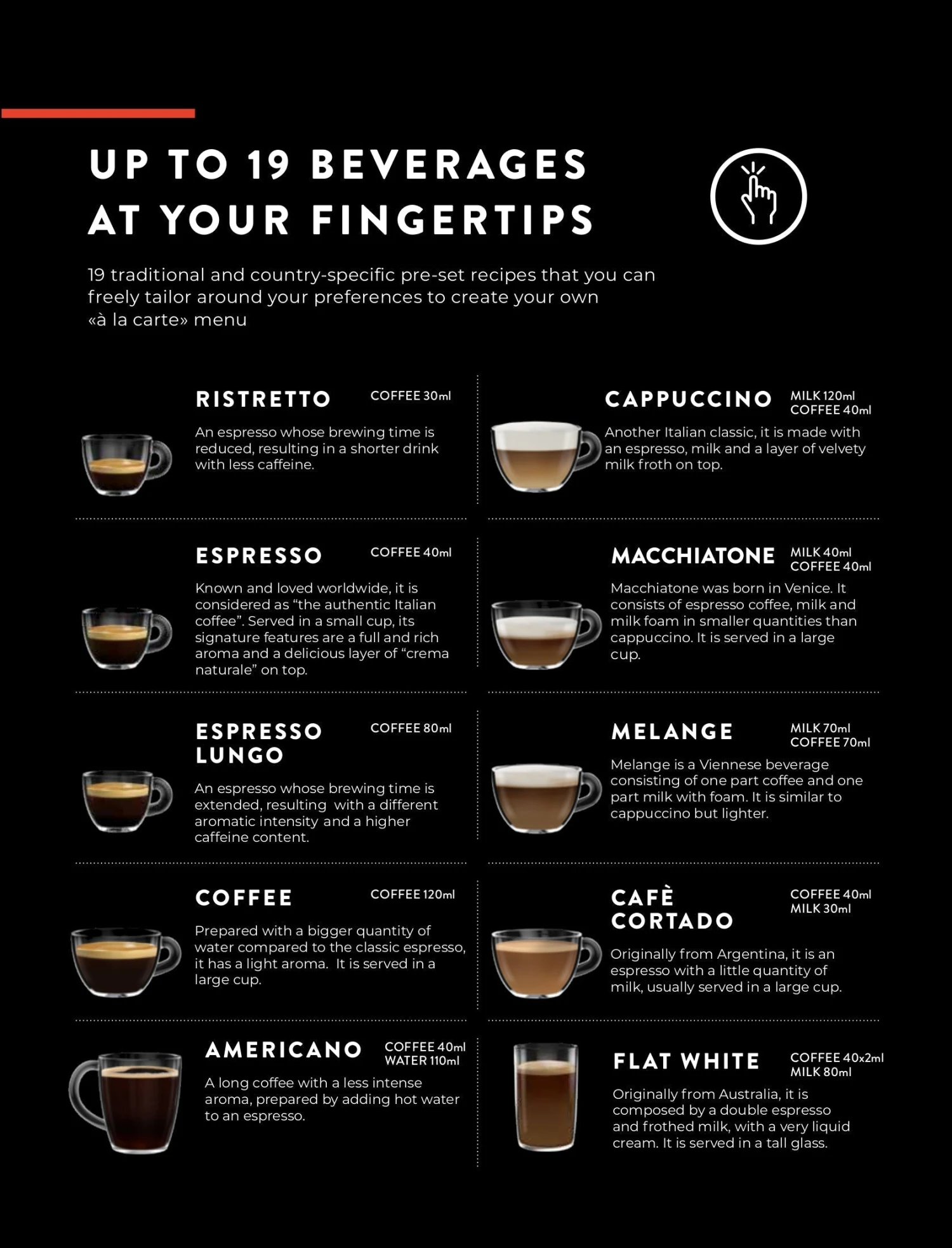 Ristretto, Espresso, Espresso Lungo, Coffee, Americano, Cappuccino, Cappuccino XL, Macchiatone, Melange, Cafe Cortado, Flat White, Caffelatte, Cafe au Lait, Latte Macchiato, Frothed Milk, Hot Milk, Hot Water, water for Black Tea, water for Green Tea