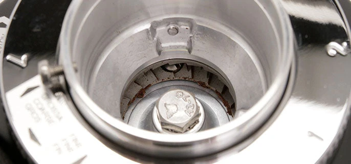 The Mazzer Mini Type B is capable of automatically dispensing timed single and double shots at the press of a button. The Mazzer Mini Type B retains the high performance motor found in its predecessor, as well as the short bean hopper, but changes significantly from there. The manual timer dial is replaced with two adjustment screws, which control the grind time for each shot, and can be manually adjusted using a small screwdriver. We’ve found that a good rule of thumb for making adjustments is that one full turn equates to around one second of grinding. Of course, that will vary by roast, but it’s a good jumping off point. Similar to the Type A, a grounds dispenser replaces the doser, funneling grounds directly into the portafilter. Grinding is easy with a push button integrated at the base of the portaholder. Press once for a single, twice for a double, or hold to grind manually. The Type B doesn’t distribute the grinds as evenly as the Type A due to the integrated button, which we didn’t prefer when we were using it. Rather than depositing them into the middle, they’re slightly more toward the back of the portafilter, which isn’t as ideal, but can be fixed by grooming the grounds as usual. The Type B, like the Type A is a serious upgrade to the Mini line, with its programmable dosing capabilities and doserless design.