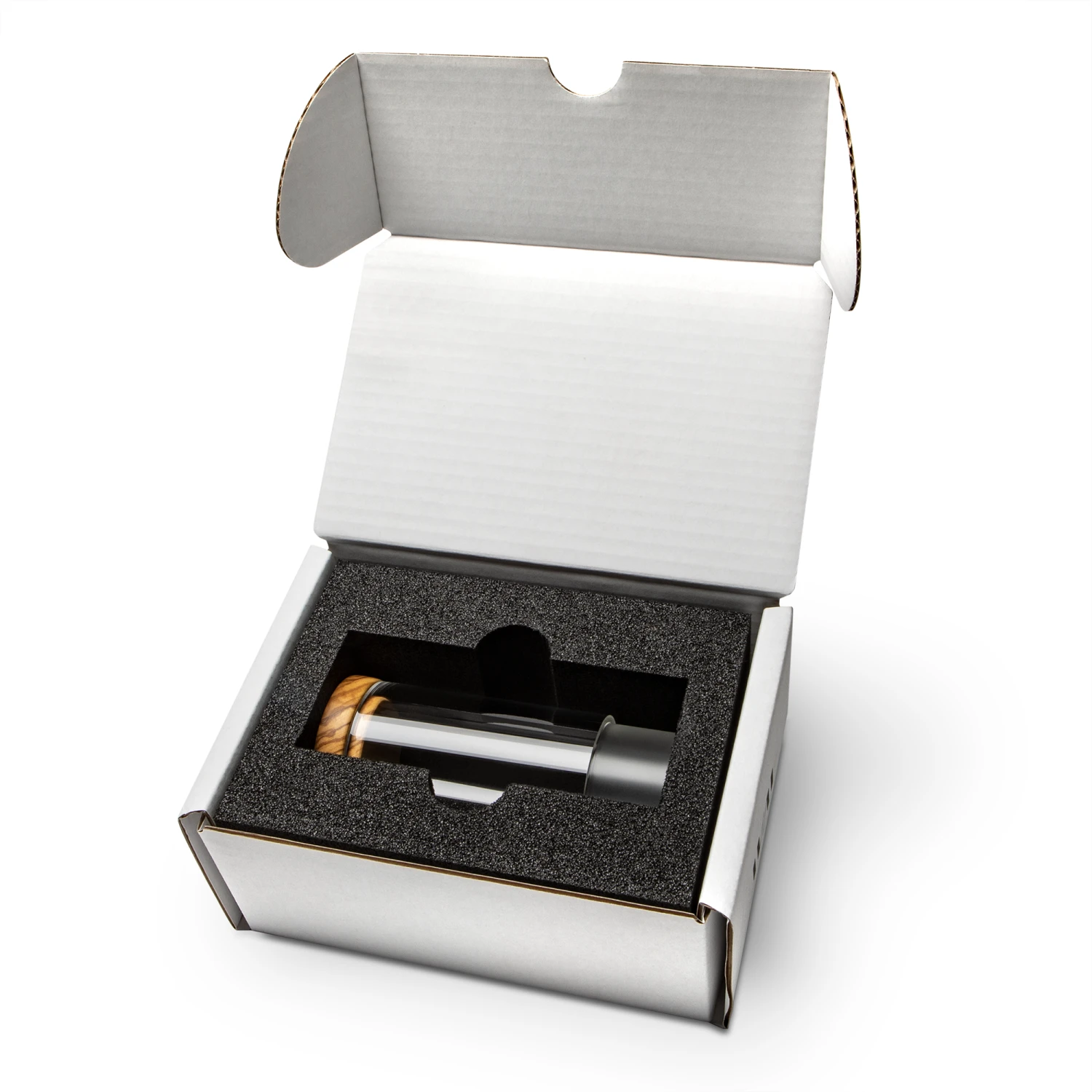 The Day Hopper is made of acrylic glass for a crystal clear and shatter resistant design. Included with the hopper is an Olive Wood lid to match with all of your other Wiedemann wood accessories.